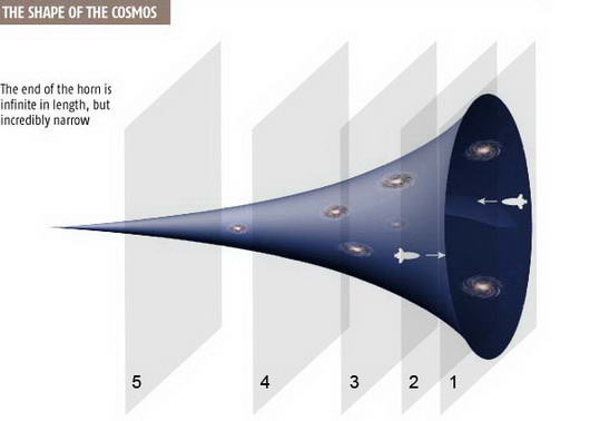Di mana pada bagian ujung belakang terompet (baca alam semesta) merupakan alam semesta yang tidak bisa diamati (unobservable), sedang bagian depan, di mana bumi dan seluruh sistem tata surya berada merupakan alam semesta yang masih mungkin untuk diamati (observable) (lihat gambar bentuk alam semesta dibawah).